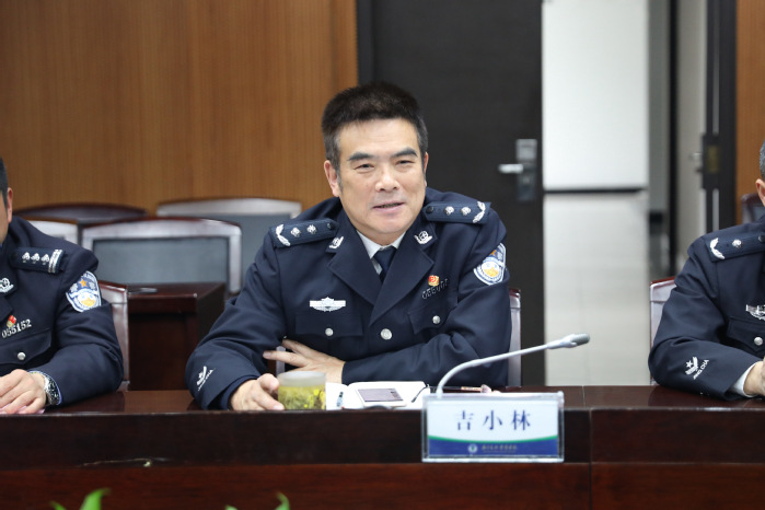 会上,吉小林对宗宏斌一行的到来表示欢迎,并结合宣传片简要介绍了我校基本情况。同时,吉小林结合分管工作向来宾详细介绍了我校的学生警务化管理工作,并希望双方能加强交流合作。宗宏斌对我校近年来的高速发展表示赞扬,希望能借鉴学习我校一些体制机制方面的经验成果,助力新疆警察学院改革发展。
