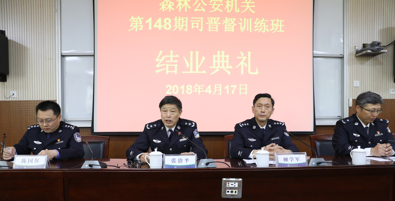 柳学军政委对本期训练班的训练成果给与了充分的肯定,对即将跨入中级警官行列的全体学员表示热烈祝贺,对学校和培训中心为培训班所做的大量工作表示感谢。他指出,随着党和国家机构改革的全面推进,公安各项改革的不断深入,森林公安面临的形式任务将更加艰巨,对此,柳政委向全体参训学员提了三点要求:一是准确把握新时代森林公安面临的新形式新任务,主动肩负起建设生态文明排头兵和美丽中国领跑员的职责,推动新时代森林公安事业新发展,彰显新作为。二是抓好“打击涉林犯罪、保护森林资源”主业,担当起森林公安的职责使命,坚持依法维护生态安全、守护林区社会治安稳定主业不动摇,同时也要勇于探索,努力争取更大的执法空间,真正成为捍卫国家生态安全的主力军。三是增强政治自觉和责任担当,打造过硬森林公安队伍,为新时代现代林业建设保驾护航,为我国生态文明建设做出应有的贡献。