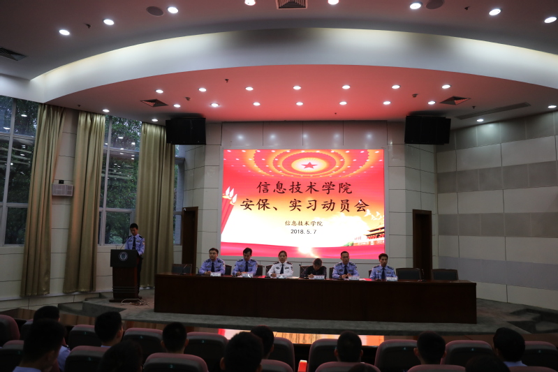 2018年5月7日晚,信息技术学院在大报告厅召开2015级安保实习动员会,信息技术学院党总支书记孙桂英、党总支副书记兼大队长许江东、副院长吴育宝、关心下一代工作委员会常务副主任徐樑英、信息大队副大队长胡睿、分团委书记杜莹、中队长邹柏林以及2015级全体学生出席会议。