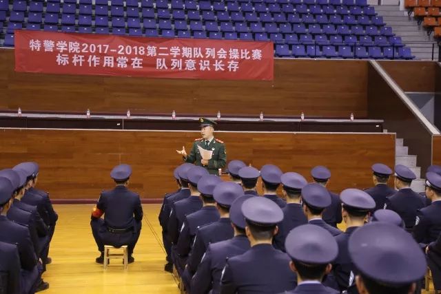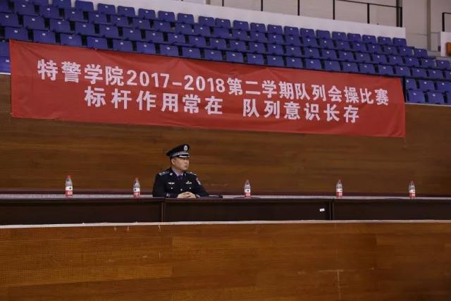 近日,特警学院2017-2018第二学期队列会操比赛于篮球馆中举行。比赛由特警学院党总支副书记、大队长柳迪文,学管老师赵良辰主持,14级参军退伍师兄杨威担任主裁判并特别聘请了江苏省武警边防总队的两名武警教官担任赛事评委。15级至17级全体同学参加比赛。大队长赛前讲话提出要求和希望。赛前,各区队同学正襟而坐,为即将开始的队列会操比赛做准备。大队长柳迪文在赛前强调了队列会操对于特警学员组织、责任意识养成的重要性,并为比赛开始揭开了序幕。