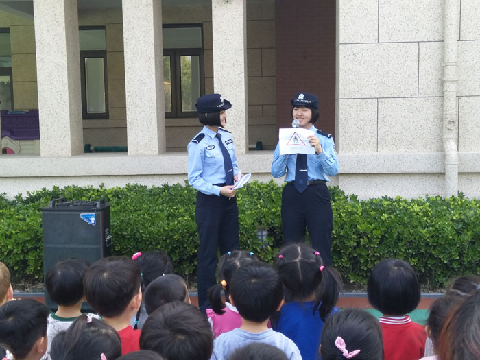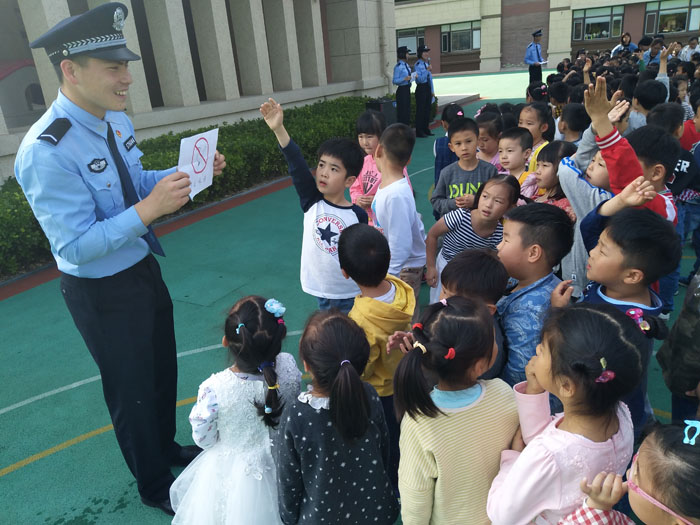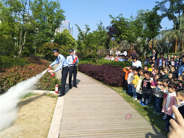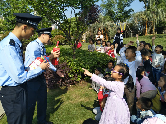 讲座结束后,志愿者们来到操场,以图片讲解的方式为全校的小朋友进行了一次认识各种安全隐患的宣讲,并与小朋友们互动交流。志愿者们手把手地指导保育师规范使用灭火器,并向幼儿园的小朋友们展示了如何使用灭火器。此时操场上骄阳似火,但仍无法阻挡小朋友们对灭火器喷出白烟这一景象的好奇,孩子们目不转睛地盯着志愿者手中的灭火器,看着志愿者精彩的示范,白烟喷出,现场传来了小朋友们激动的掌声。