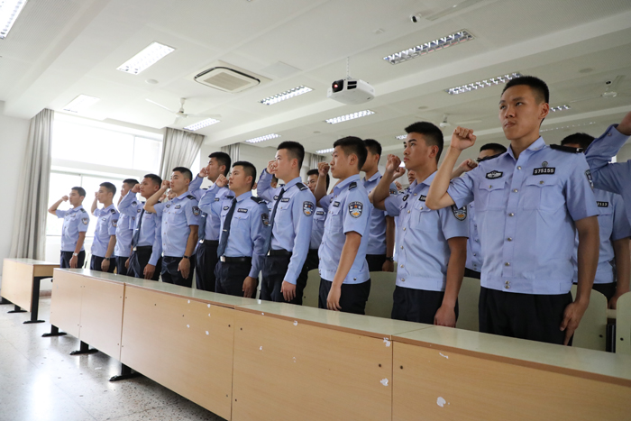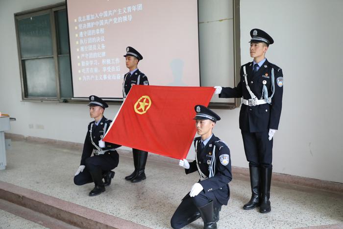 伴着国旗护卫队四名护旗手铿锵有力的步伐,中国共产主义青年团团旗被迎到台前,全体新入团的同学在情报1601区队高俊杰同学的带领下进行宣誓,“我志愿加入中国共产主义青年团,坚决拥护中国共产党的领导,遵守团的章程,执行团的决议,履行团员义务,严守团的纪律,勤奋学习,积极工作,吃苦在前,享受在后,为共产主义事业而奋斗。”教室上空回荡着新团员们整齐洪亮的声音。