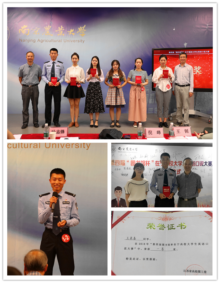 在图书馆吉莉娅老师的指导下,王枭嘉同学认真准备,反复练习。5月18日,在南京农业大学举行的总决赛中,王枭嘉同学根据题目要求,演讲内容丰富,紧扣主题,观点鲜明,语言流畅,台风稳健,充分展示了我校学子良好的精神风貌和厚实的综合素养,最终以全场第二名的好成绩荣获一等奖,受到各高校领导、参赛选手和评委的高度赞扬,为我校获得了荣誉。