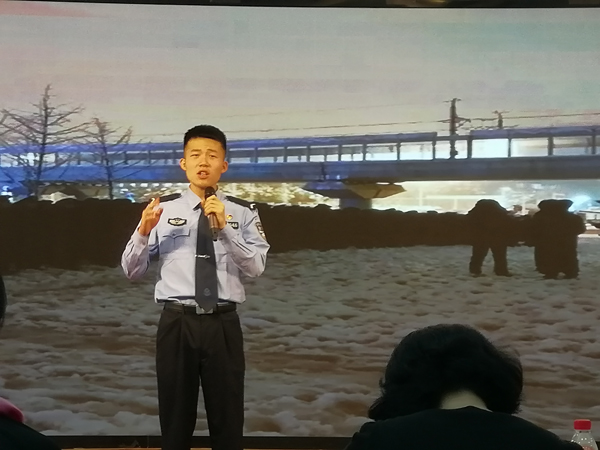 第一轮限题演讲,六名选手倾情诉说自己的心路旅程。我校祁辉同学从家乡民警英勇献身,刀口下抢救民众的故事讲起,真实展现新疆反恐道路上,警察们血与泪的故事。为了家乡的和平,为了没有战争和牺牲,祁辉追随英雄的步伐踏入警门,用自己的青春诠释何为真正的男儿。接着他与观众分享了年初大雪之夜清扫仙林大学城的亲身经历,代表所有的南森学警呐喊心声,彰显新时代青年的勇敢与担当,赢得评委和观众们的高度赞扬。第一轮,祁辉以第一名的成绩晋级。
