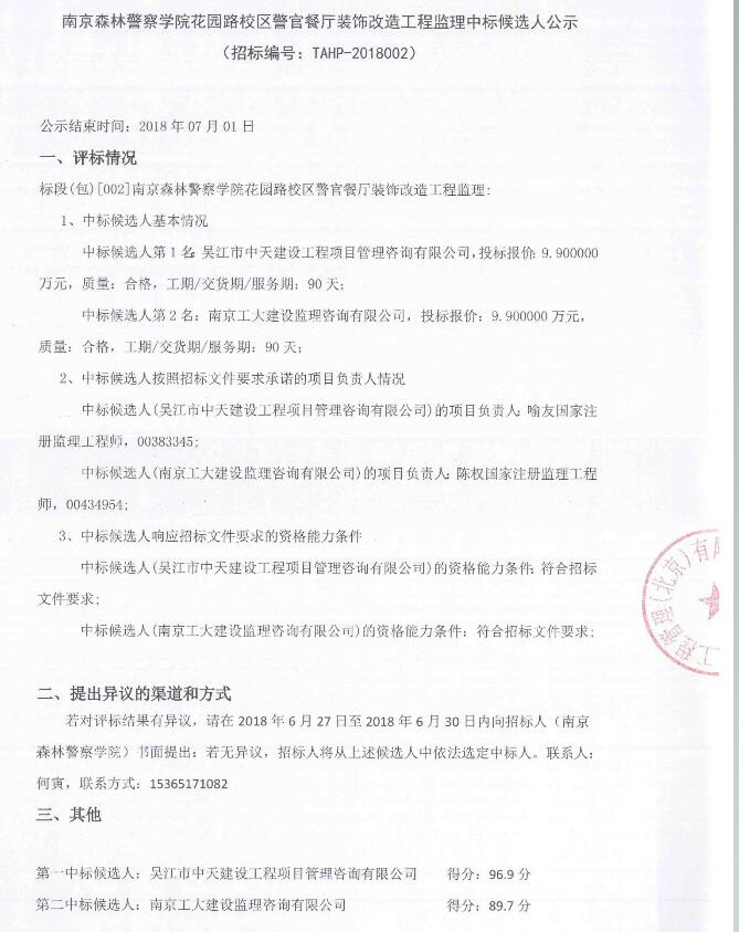 南京森林警察学院花园路校区警官餐厅装饰改造工程监理中标候选人公示(招标编号:TAHP-2018002)