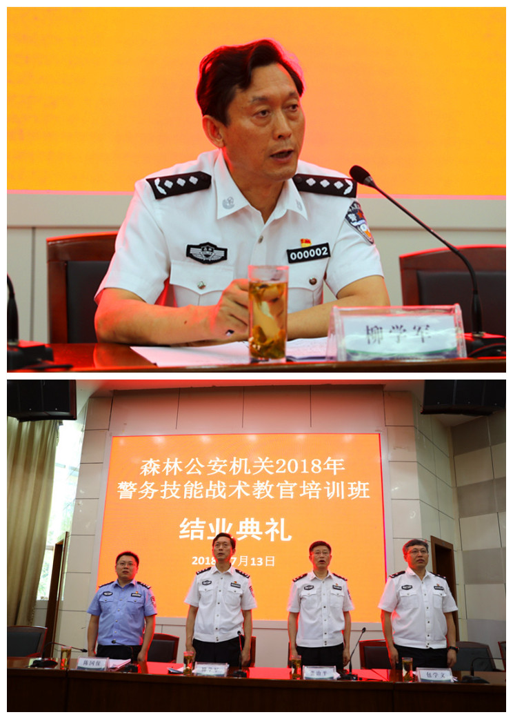 柳学军政委对本期训练班师资、管理、学员的学习情况表示肯定,并向南京森林警察学院所做的大量工作表示感谢。随后,柳政委代表国家林业和草原局森林公安局就当前森林公安工作面临的形势讲了三点要求:一是要深入学习贯彻习近平新时代中国特色社会主义思想的主要内容和精神实质,保持政治上高度自觉;二是要抓住国务院新一轮机构改革和全国森林公安改革这一重大历史机遇,强化责任感、使命感和紧迫感,从细节做起,脚踏实地,不折不扣地落实中央决策;三是要重视教育培训,强化业务工作。通过教育培训,提升民警适应工作的能力和素质,达到向培训要警力要战斗力的目的。
