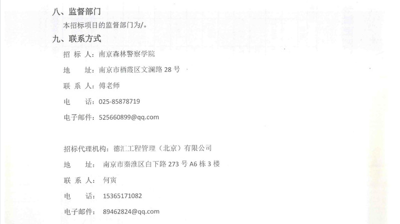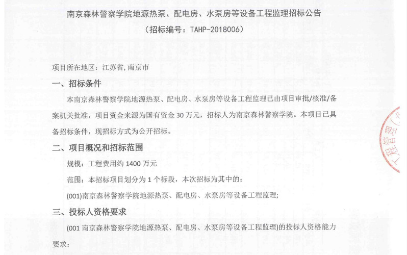 南京森林警察学院地源热泵、配电房、水泵房等设备工程监理招标公告