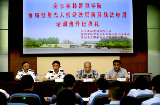 为积极响应公安部“科技兴警”的号召,严格规范警用无人驾驶航空器的飞行操作,大力提高警用无人驾驶航空器在森林公安实战中的利用效率,2018年8月1日上午南京森林警察学院首期警用无人驾驶航空器驾驶资质及战法应用培训班在仙林校区顺利开班,来自广东、贵州、江西、青海、湖北、湖南、福建、河南、江苏等省森林公安机关的32名学员参加培训。南京森林警察学院叶卫副校长,侦查学院厉开平副院长,深圳科卫泰实业发展有限公司吕振义董事长,盐城市天眼航空运动培训中心陈惠彪主任出席开班仪式。