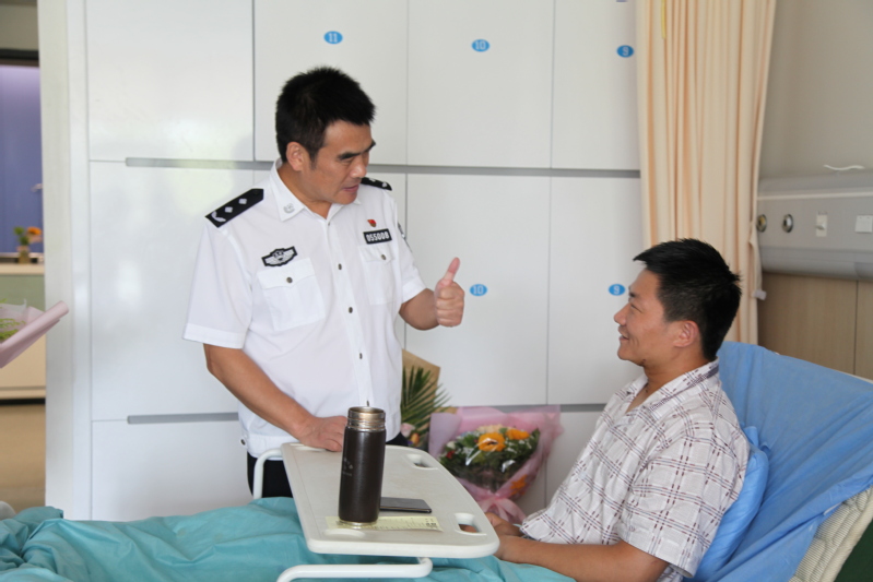 吉小林副校长来到病房,代表学校向顾全同志表示关心慰问,详细了解了顾全同志的处警经过。他表示,顾全校友的英勇事迹在学校引起强烈反响,牵动着南森每位师生的心,老师们为之感动,同学们以你为榜样,学校以你为荣。长期以来,你和广大校友用实际行动践行了“对党忠诚、服务人民、执法公正、纪律严明”的总要求,彰显了学院政治立场坚定、专业知识扎实、警务技能过硬突出的人才培养特色。最后,吉小林副校长代表学校祝福顾全同志早日康复,期待他再次回到母校。