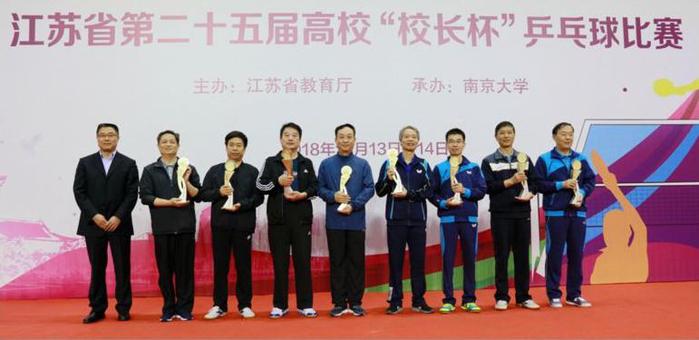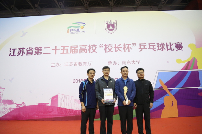 第二十五届校长杯乒乓球比赛在南京大学仙林校区举行,来自全省108所高校及江苏省教育厅、江苏省教育考试院、建设银行的共111支代表队600多名运动员参加了比赛。我校张高文,张治平、叶卫等主力队员奋勇争先、顽强拼搏,齐心协力、团结协助。指导团队精心研判,排兵布阵,指导有方,保障有力。在一天半的比赛中,我校一路闯关,力克劲旅,勇夺桂冠!