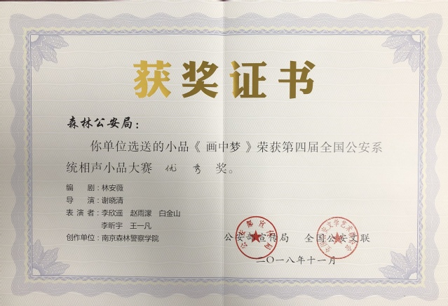 《画中梦》讲述的是南森的一名大一新生在加入“木林画社”后做的一场警察梦。在梦里,她化身为公安系统的知名刑侦专家,运用所学的专业知识与绘画技能屡破奇案、屡立新功,如重塑颅骨、模拟画像等。该作品反映了警校学子对习总书记提出的“对党忠诚、服务人民、执法公正、纪律严明”总要求的矢志追求,表达了他们誓言建设平安中国的壮志雄心和伟大梦想。特警1702区队李欣遥、刑技1703区队王一凡、侦查1702区队白金山与赵雨濛、侦查1703区队李昕宇等5位同学真挚而又生动的表演赢得了观众的热烈掌声。
