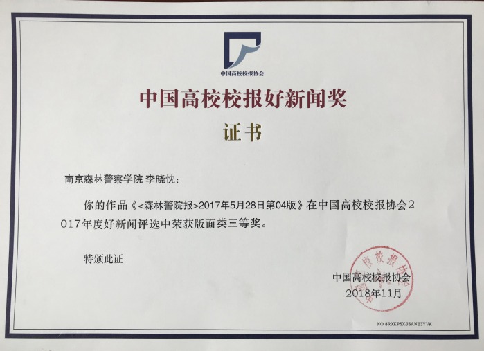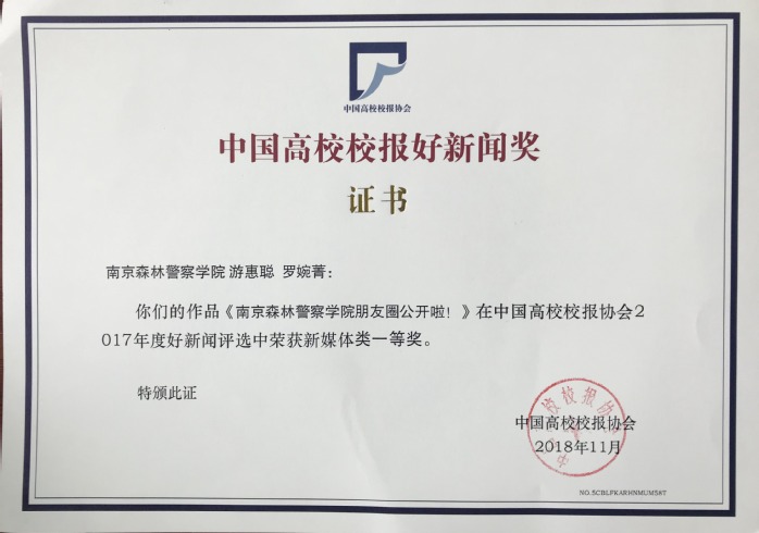 《南京森林警察学院朋友圈公开啦!》(作者:侦查1601游惠聪、情报1702罗婉菁)获新媒体类一等奖;《<森林警院报>2017年5月28日第04版》(作者:公管1602李晓忱)获版面类三等奖。