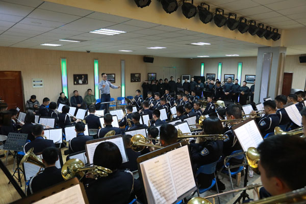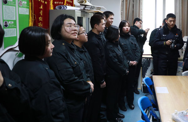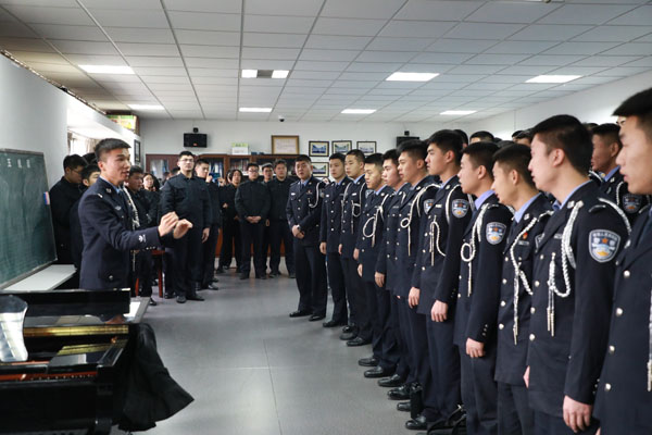 王传敏副书记一行还参观了我校特警训练、学生社团活动等。我校合唱团表演了两首曲目《西风的话》与《满江红》,受到了来访师生的一致好评,两校同学进行了歌曲互动,现场气氛热烈。我校警乐团为来宾演奏了《Disco Lives》与《蓝色山脉》,风格迥异的两首曲目让人陶醉其中。在书法协会活动室,书法协会成员还与来访同学进行了书法交流,并赠予来访同学“警魂”二字。