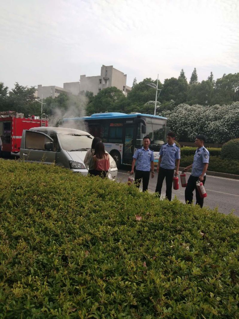 2019年6月15日下午16:30左右,侦查学1803区队冉洪全、崔栋、赵钰博三名同学正在学校大门岗值班,看到马路边有人一边跑一边在喊:“车子着火了,谁有灭火器”,三名同学立马判断可能是有车辆失火了,情况一定非常危急,便立刻到门卫室一人拧起一瓶手提式干粉灭火器冲向了失火方向。跑到文澜路公交站台附近,只见一辆商务车前座冒着滚滚黑烟,夹杂着火苗和噼啪声,前档玻璃已经局部烧化,冉洪全、崔栋、赵钰博三人冒着车辆可能爆炸的危险,立刻绕到上风口,拔掉保险插销,对准火源进行灭火,十来分钟后,明火扑灭,失火得到有效控制。此时,在边门值班闻讯赶到增援的宋雨泽同学见围观群众比较多,行驶车道上停车问情况的车辆多,已经造成了交通堵塞,便主动疏散围观群众和停留车辆,排除交通安全隐患,等消防车到达后,四名同学才悄然撤离现场,回到学校继续上岗工作。