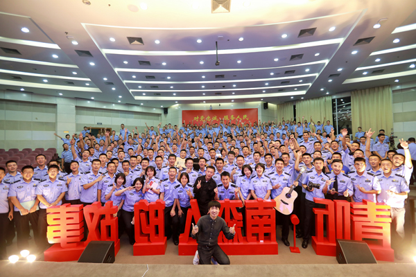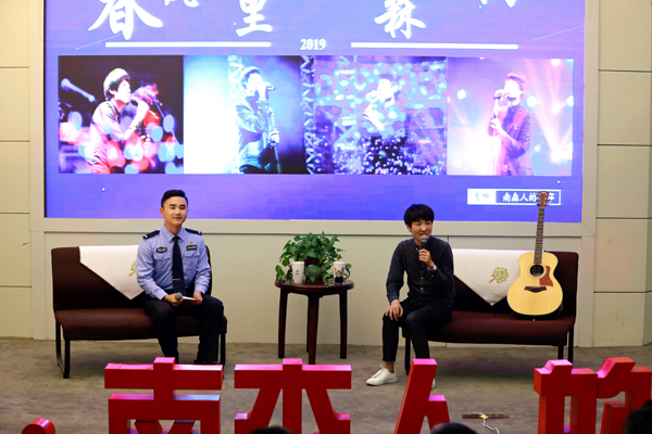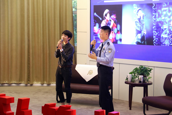 分享会在郭倍倍与合唱团副团长侦查学1705区队徐天豪合唱的“与我轻轻唱”中拉开帷幕。一曲过后,倍倍分享了自己的青春奋斗故事。他说,三年的警校生活有太多美好的回忆,最令他受益终生的是南森给予他的坚忍品格。虽然在追逐音乐梦想的路途中遇到过不少艰难困苦,但南森对他的磨砺让他无论身处何种挫败的境遇都无所畏惧、勇往直前。之后,一首“华年”点燃全场,寄托的是一个大师兄对这个毕业季即将离校的师弟师妹们的美好祝福。