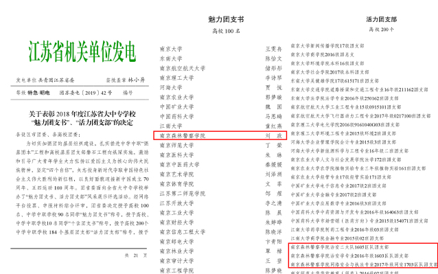 为切实加强团的基层组织建设,扎实推进高校基层团支部“磐石工程”向纵深实施,激励和引导广大青年学生大力弘扬以爱国主义为核心的伟大民族精神,树牢“四个意识”,坚定“四个自信”,坚决做到“两个维护”,矢志投身新时代夺取中国特色社会主义伟大胜利的新征程,以良好面貌迎接新中国成立70周年、纪念五四运动100 周年,共青团江苏省委面向全省大中专学校举办了“魅力团支书、活力团支部”风采展示评选活动。经网络平台投票、申报材料综合评审,我校治安1602团支部书记刘政同学从全省高校数万名团支书中脱颖而出,被评为“魅力团支书”,全省高校仅100名团支书获此殊荣。治安1603团支部、治安1605团支部和网安1703团支部以扎实有效的团支部工作被评为省级“活力团支部”,全省仅200个基层团支部获此殊荣。