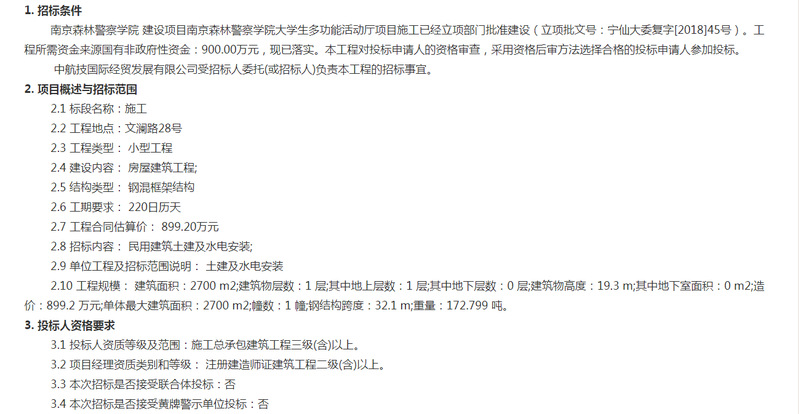 关于南京森林警察学院大学生多功能活动厅项目的施工招标公告(招标编号: AXL190062-01SG)