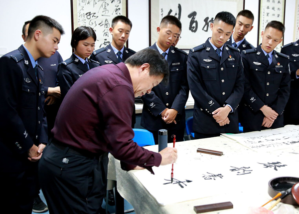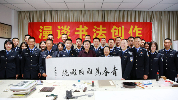 11月4日晚,原烟台市森林公安局局长、中国书法家协会会员、我校2017年“双千”教官于元魁老师,为书法协会的同学们开设了“漫谈书法创作”专题讲座,校团委书记林安薇、副书记王智等参加了活动。