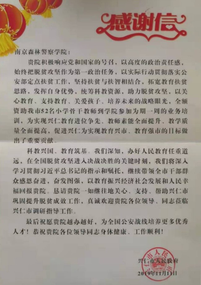 根据公安部党委关于定点扶贫工作的决策部署,学校高度重视对口帮扶贵州省兴仁市、普安县脱贫攻坚。党委书记王邱文带队深入兴仁、普安两地积极对接对口帮扶工作,校长张高文出席指导兴仁市教师培训班开班仪式,财务处牵头做好统筹协调,全体教职工群策群力为兴仁市、普安县开展了一系列帮扶活动。日前,贵州省兴仁市人民政府致函我校,感谢我校对当地脱贫攻坚工作的关心和支持。