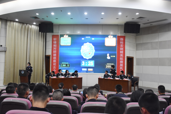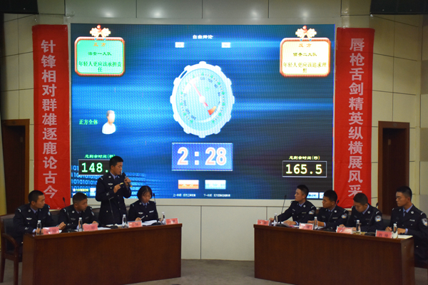 最为激烈的是冠军争夺赛,由信息大队对阵治安二大队,辩题为“当今中国应不应该降低刑责年龄”,在全场同学和老师的掌声中,双方队伍上台入座,逐鹿天下。辩论场上,八位辩手引文据法,逐步论述,不断推进己方论证,同时反应迅速,抓住对方逻辑漏洞、表述漏洞,多角度、多方面地发动攻击,双方你来我往,现场气氛紧张热烈,观赛席上不时爆发出阵阵掌声。经过几轮交锋,特别是自由辩论环节之后,场上硝烟四起,双方各有立有破,到了最后的关键时刻,交给双方的四辩总结陈词,他们冷静分析,打扫战场,指出对方破绽,强调己方立场,引出核心价值观,升华了整场比赛,也将现场气氛推向最高潮。