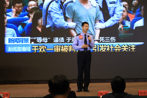 李鼎华同学则另辟蹊径,题目《另一种温度》引发大家的深思,他分享了于欢辱母杀人案,从于欢被判无期徒刑,引起大家公愤,再到法院二审,判定于欢属于防卫过当,判有期徒刑5年。他用真实的案例告诉大家,法律不能被舆论所干扰,但是法律审判要有人情。“法治兴则国家兴!”李鼎华最后点出主题,情感饱满,掷地有声!场下掌声雷动。