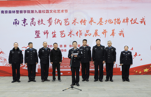 党委副书记、纪委书记陶珑在活动中致辞,他指出,我校有着注重弘扬中华优秀传统文化的优良传统,南京高校剪纸艺术传承基地在我校设立,不仅是对我校师生传承剪纸艺术、弘扬中华优秀传统文化的肯定,也是赋予我校更大的责任,我们将把剪纸与时代特点相结合,与公安实践相结合,在守正创新中传承剪纸艺术。本次艺术作品展,是学校第九届校园文化艺术节的系列活动之一,是学校落实文化育警、文化强警战略,扎实推进公安文化建设的重要举措,以艺术创作和交流的形式向新中国成立70周年献礼。希望同学们尽情感受中华优秀传统文化的魅力,坚定文化自信,增强文化自觉,努力把自己锻造成具有“剑胆琴心”的合格公安事业接班人。