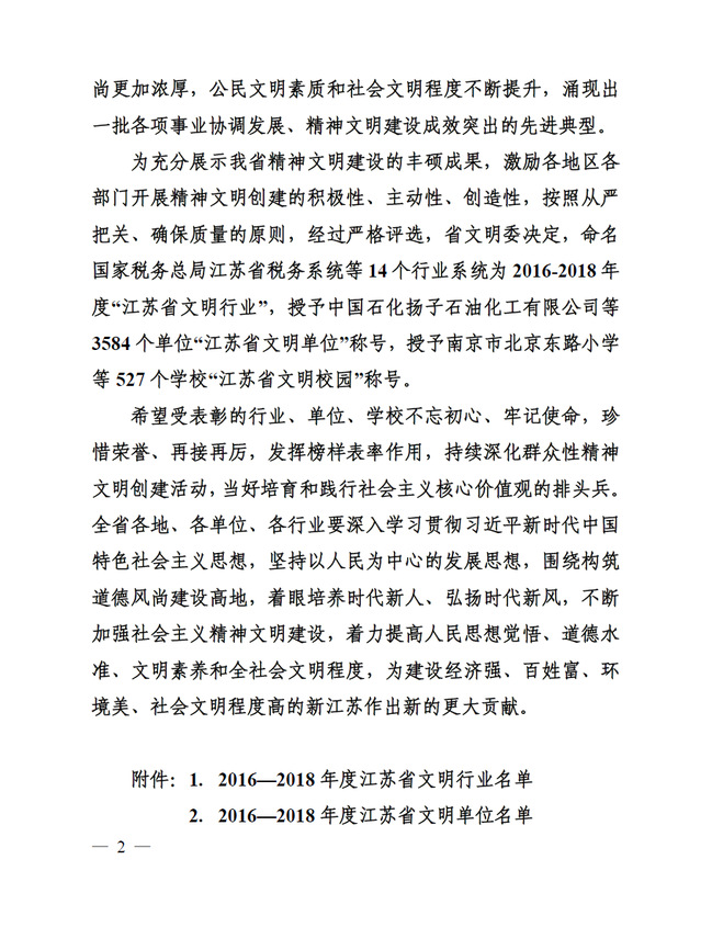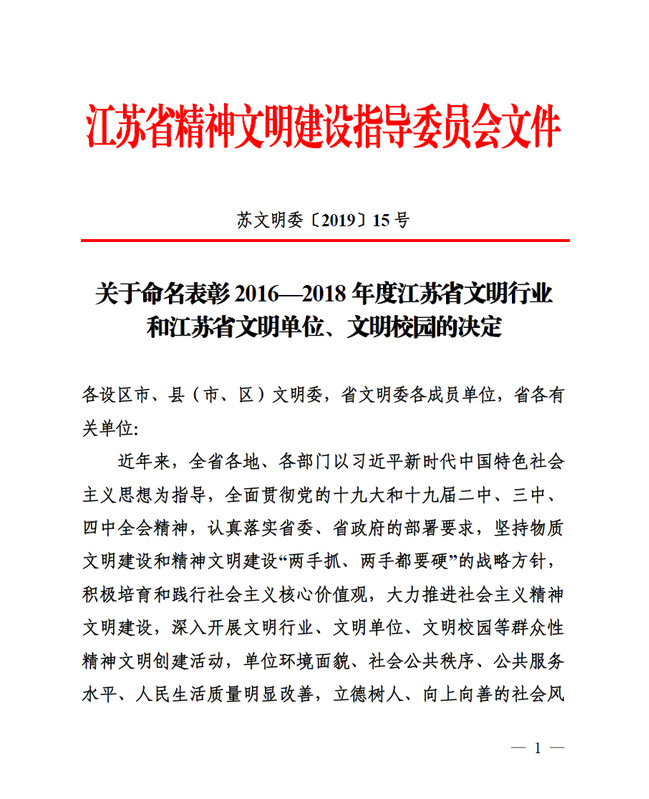 日前,江苏省精神文明建设指导委员会命名表彰2016-2018年度江苏省文明行业和江苏省文明单位(文明校园)。我院被授予 “20162018年度江苏省文明校园”荣誉称号。这是我院在精神文明建设工作中取得的又一重大喜人成绩。