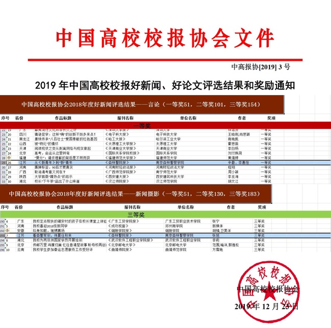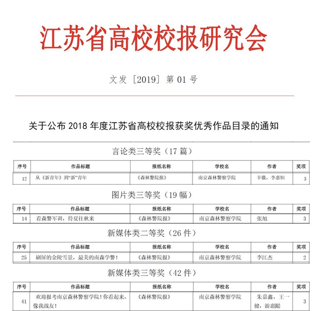 中国高校校报年度好新闻、好论文评选和江苏省高校校报年度优秀作品评选每年开展一次。其中,中国高校校报协会是全国高校校报工作者参加的全国性学术团体,为国家一级协会。江苏省高校校报年度优秀作品评选是全省高校校报新闻领域内的最高奖。此次获奖是对南京森林警察学院校报记者团和新媒体记者团日常工作的充分肯定,更向外界展现了南京森林警察学院的良好精神风貌,具有十分积极的意义。