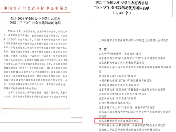 近日,共青团中央青年发展部下发了《关于2020 年全国大中专学生志愿者暑期“三下乡”社会实践活动的通报》,我院刑事科学技术学院法证雄鹰小分队从全国25万多支实践队伍中脱颖而出,被评为2020年全国大中专学生志愿者暑期“三下乡”社会实践活动优秀团队。