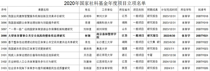 日前,2020年度国家社会科学基金年度项目经受理申报、通讯初评、会议评审、网上公示等程序和全国哲学社会科学规划领导小组批准,正式公布了立项课题名单。我院何钢教授申报的《大型体育赛事公共安全风险的整体性治理研究》获得立项资助,这是特警学院首次获得国家社科基金项目资助。