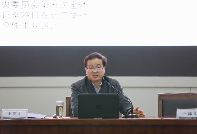 王明生以《学习贯彻十九届五中全会精神 开启全面建设社会主义现代化国家新征程》为题,围绕党的十九届五中全会的召开背景、会议内容及其《建议》的起草;深刻认识我国进入新发展阶段的重大意义、有利条件和重要特征;准确把握2035年远景目标和“十四五”时期我国发展的指导方针、主要目标、重点任务;牢牢把握构建新发展格局的战略构想和重要着力点;坚持党的全面领导,动员各方面力量为实现“十四五”规划和2035年远景目标而团结奋斗五个方面,对全会精神进行了全面系统的阐述,整场报告极具思想性、理论性、针对性,对广大师生认真学习领会、深入贯彻落实五中全会精神有很强的指导意义。