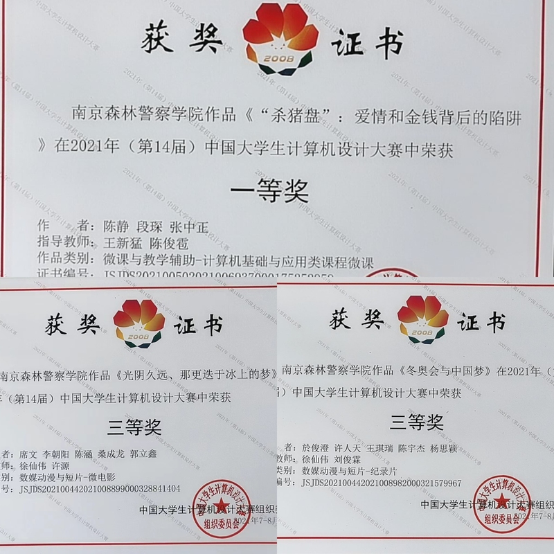 决赛中,由王新猛院长、陈俊雹老师指导,张中正,段琛,陈静组队参赛的作品——《“杀猪盘 爱情和金钱背后的陷阱”》荣获微课组别一等奖;由徐仙伟、许源老师指导,席文、李朝阳、陈涵、桑成龙、郭立鑫组队参赛的作品——《光阴久远、那更迭于冰上的梦》荣获冬奥会微电影组别三等奖;由徐仙伟、刘俊霖老师指导,王琪瑞、许人天、於俊澄、陈宇杰、杨思颖组队参赛的作品——《“冬奥梦与中国梦”》荣获冬奥会纪录片组别三等奖。