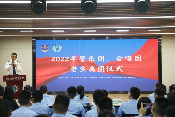 吉小林副院长为警乐团、合唱团2019级成员代表赠送离团纪念品并致辞。他对同学们在警乐团、合唱团的表现给予肯定,对同学们提出几点希望:一是学会感恩,感谢学院和老师的培养、感谢努力的自己;二是学会坚持,做一个坚守者,用坚守诠释责任与担当;三是学会包容,在团队里懂得欣赏他人、赞美他人,相互团结。他指出,南森警乐团、合唱团是学院的文化名片,在这里,同学们不仅提升了文化素养,还锤炼了品格,变得能吃苦、能战斗、能奉献,希望同学们在今后的学习工作中传承和发扬这种精神,书写出最动人的南森人的故事,做最好的自己。
