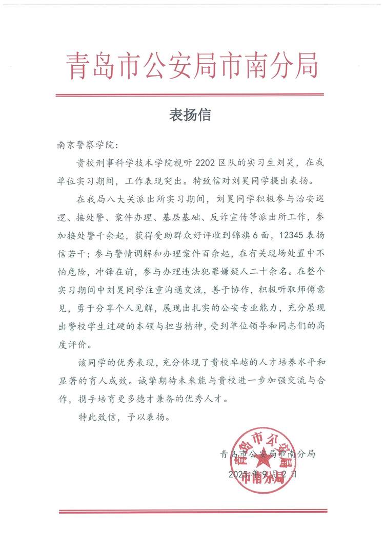 近日,青岛市公安局市南分局向我校发来表扬信,对我校刑事科学技术学院视听2202区队刘昊同学在实习期间的卓越表现予以充分肯定和诚挚感谢。