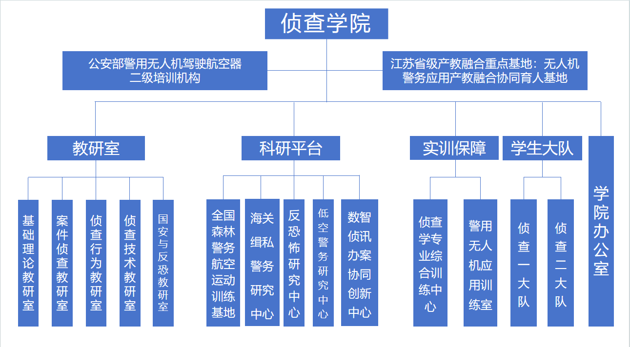 侦查学院下设5个教研室、1个实验实训中心、1个办公室和2个学生大队,拥有江苏省高等学校优秀科技创新团队1个、江苏省级产教融合重点基地1个、省部级科研平台1个、校级重点培育建设实战科研平台1个以及校级科研平台3个。