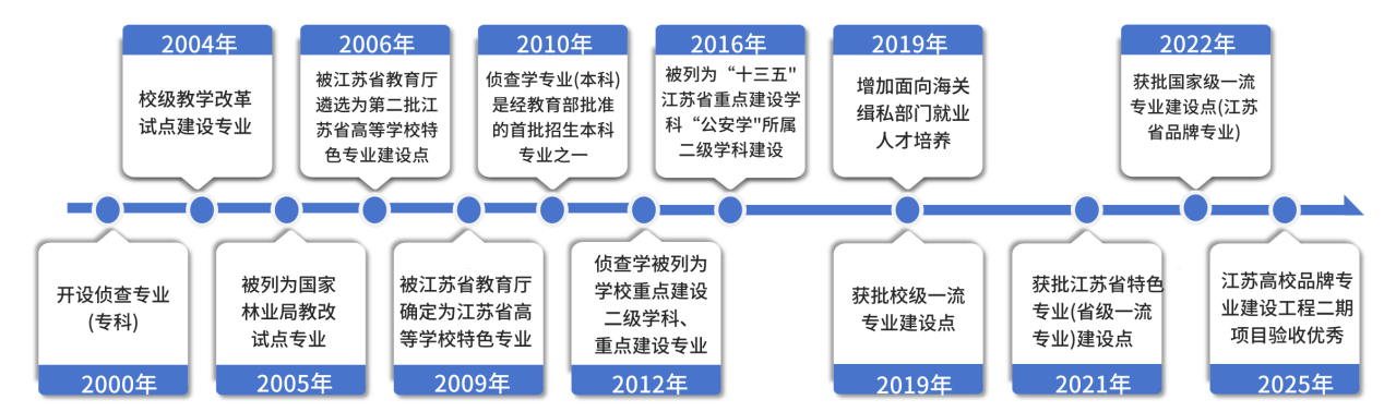 2000年,南京森林公安高等专科学校正式成立侦查系;2010年,开始招收侦查学专业本科生。2022年,侦查学专业成功获批国家级一流本科专业建设点;2025年度江苏高校品牌专业建设工程二期项目侦查学专业验收结果为优秀。经过25年的砥砺奋进,侦查学院实现了从专科新兵到国家级一流本科专业建设点的跨越式发展。