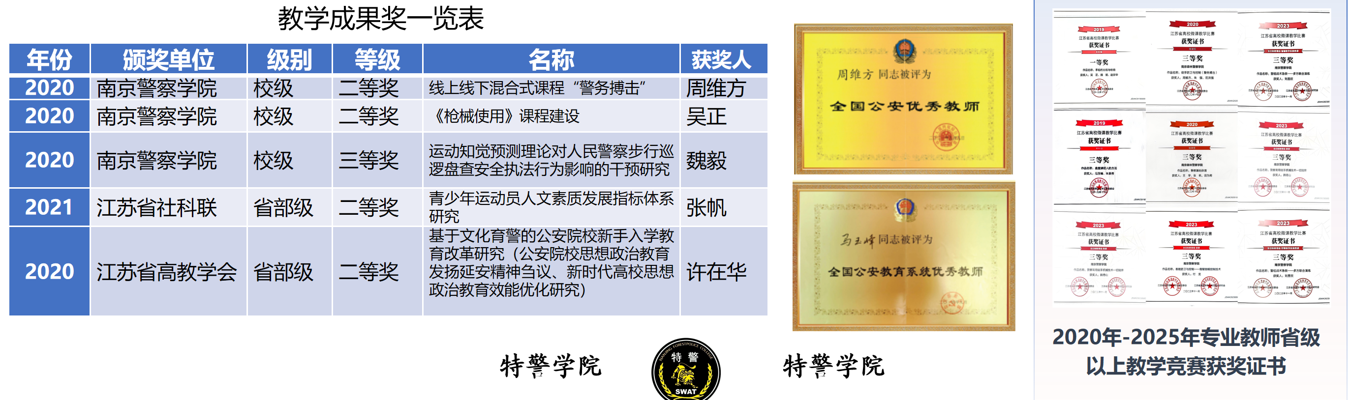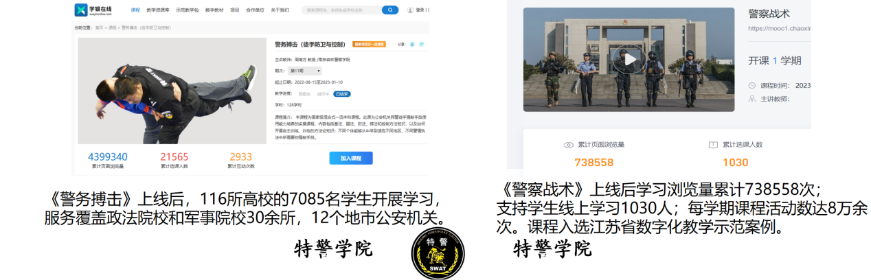 1.校局合作深化:与南京市特警支队建立战略协作关系,科学制定专业学生暑期驻训方案;承办全国特警挑战赛执裁工作,获评“优秀组织单位”。