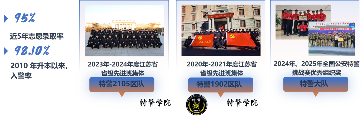 2.专业能力突出:用人单位对毕业生总体满意度达98%以上,2010年升本以来入警率保持高位。涌现出江苏省省级优秀班集体特警2105区队、特警1902区队等先进集体。