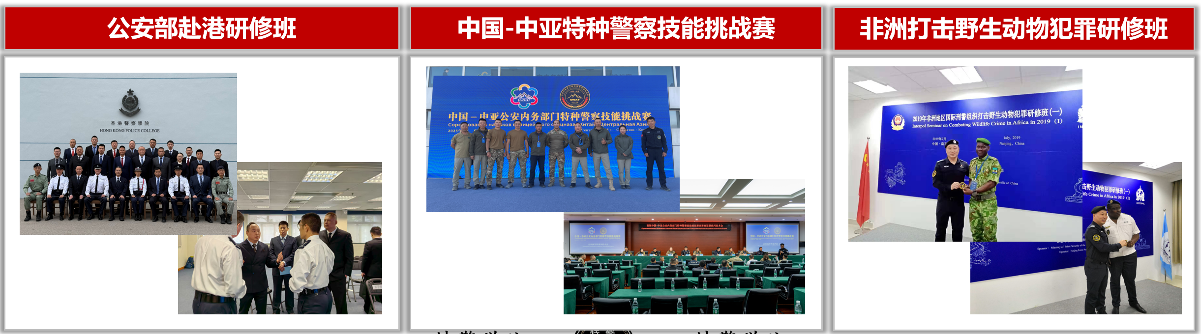 2.国际交流拓展:参加公安部赴港战术教官研修班、非洲地区国际刑警组织打击野生动物犯罪研修班、执裁首届中国-中亚公安内务部门特种警察技能挑战赛等,提升国际影响力。