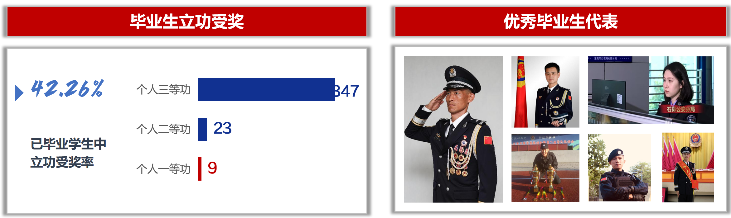 4.立功受奖率高:毕业学生中立功受奖率达42.26%,其中个人一等功9人次、个人二等功23人次、个人三等功400多人次。近五年毕业生中,个人三等功19人次、个人嘉奖95人次,获公安部二级英模1人。