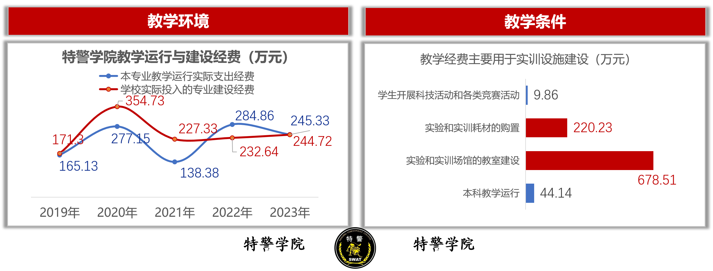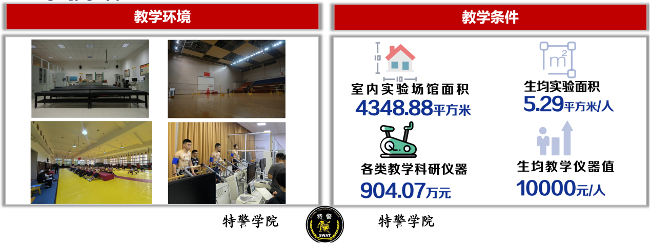 3.教学条件保障:拥有警察战训创伤防护实验室、地下靶场、游泳馆、警务技战术实训场等实训场馆,生均实验面积5.29平方米、生均教学仪器值10000元。