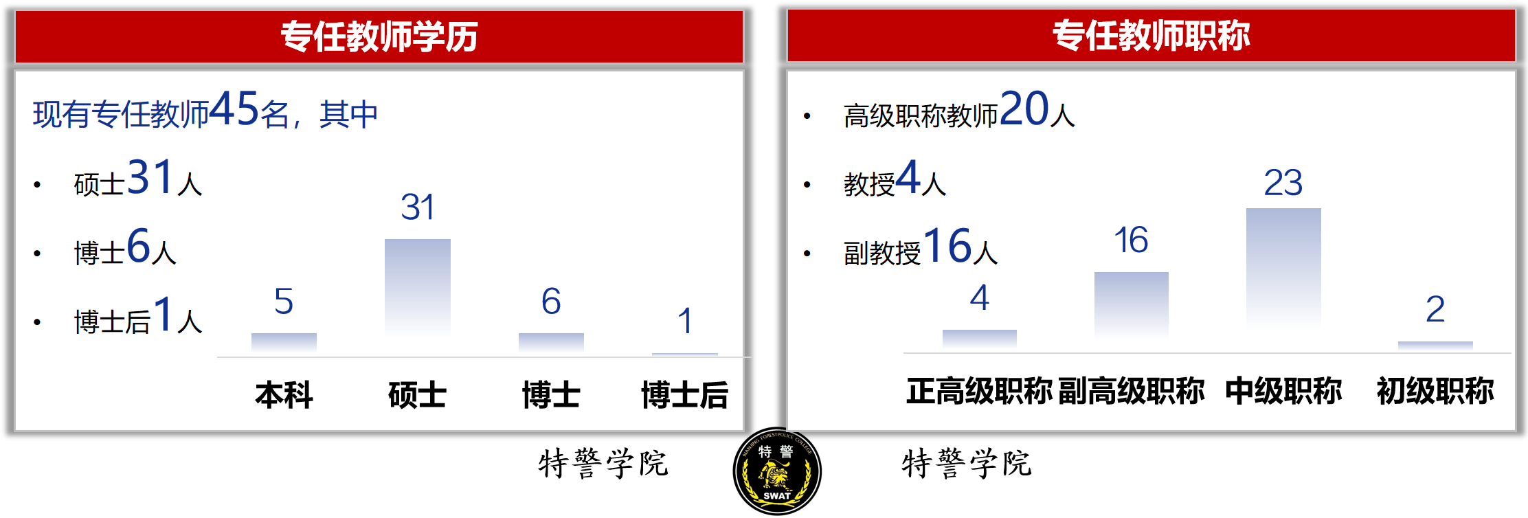 1.专任教师团队:现有专任教师45人,其中教授4人、副教授16人,高级职称比例44.44%;博士6人、博士后1人,硕士以上学位占比82.2%。拥有公安部优秀教师2人、全国公安教育工作成绩突出教师1人、江苏省“333工程”培养对象1人、江苏省“青蓝工程”优秀团队1个。