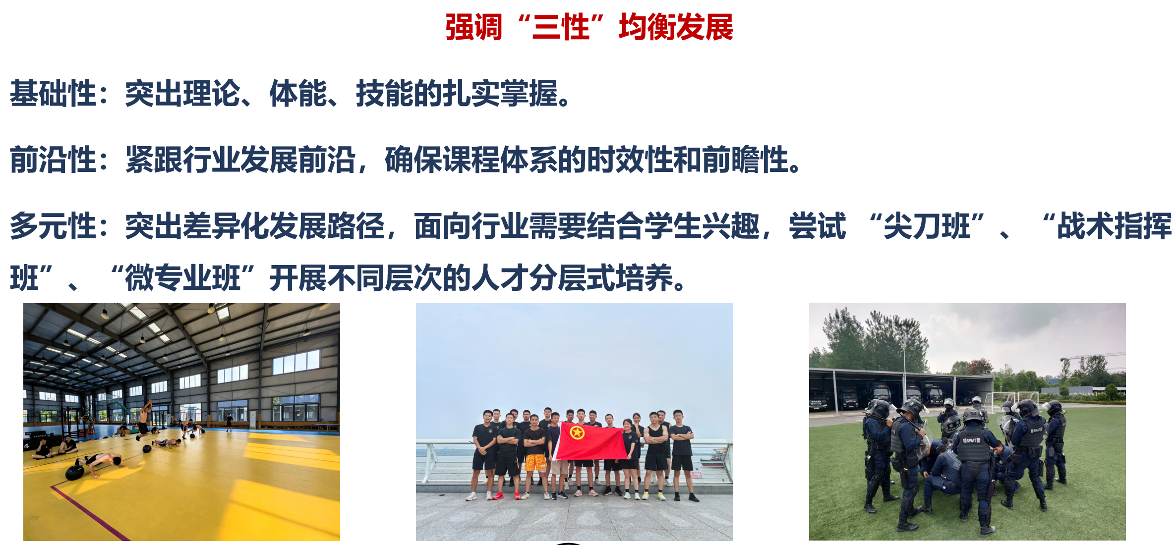 1.“一体两翼”培养理念:确立“特别有信念、特别有担当、特别有本领、特别有纪律”的培养目标,构筑“四梁八柱”培养体系(即公安基础、警务素养、特警战训、质量监控等四梁,以及课程体系、教学体系、信念体系、训练体系、实战体系、纪律体系、评价体系、反馈体系等八柱)。