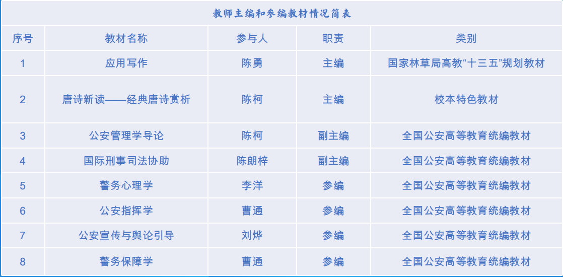 教师主编或正在参与编写多部公安部部级规划教材。