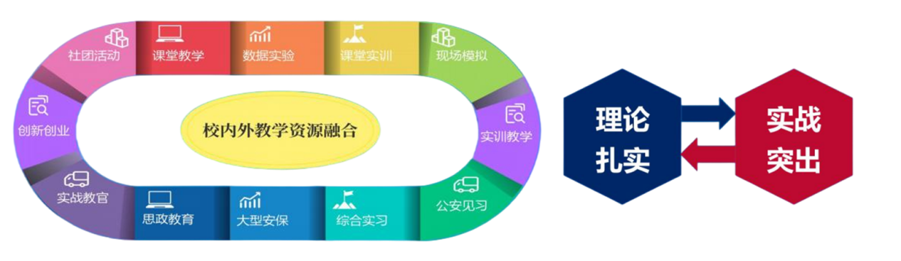 统筹校内外资源,构建“课堂教学—实验实训—综合实习—公安见习—毕业实习—创新创业—社团活动”全链条育人体系。校内通过实训室开展模拟教学、数据实验,校外与公安机关建立校局协同育人机制,组织学生参与公安见习、大型安保。