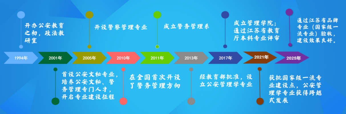 2010年,学院开启本科办学,在全国首开警务管理方向;2013年,经教育部批准设立公安管理学专业;2017 年,通过江苏省本科专业评审;2022年,获批国家级一流专业建设点;2025 年,通过江苏省品牌专业(国家级一流专业)验收。