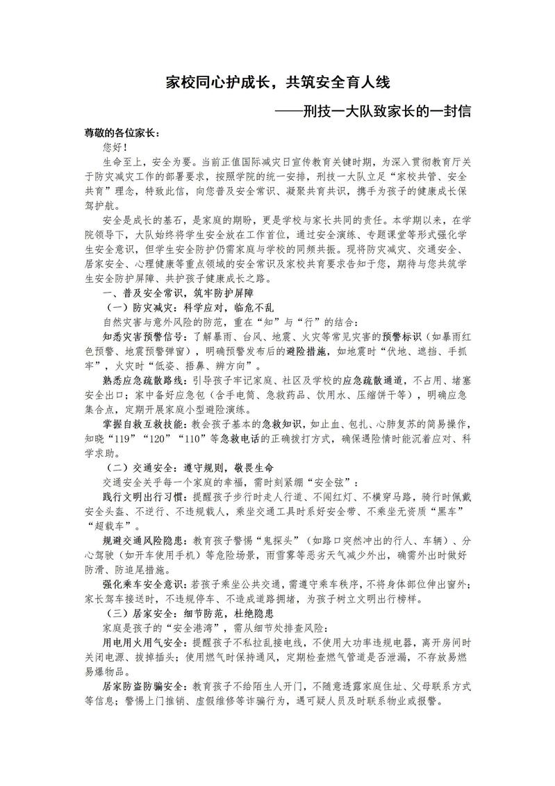 此外,大队统一撰写了《家校同心护成长,共筑安全育人线——刑技一大队致家长的一封信》,并由学生转发给家长。信中详尽阐释了家庭安全防范的关键要点,从防灾减灾、交通安全、居家安全以及心理健康等方面给出具体建议,呼吁家长切实履行监护职责,加强日常陪伴与风险教育,引导家长重视家庭安全教育,与学校构建教育合力,进一步浓厚了家庭安全教育氛围,有力促进了家校携手守护学生安全互动格局的形成。