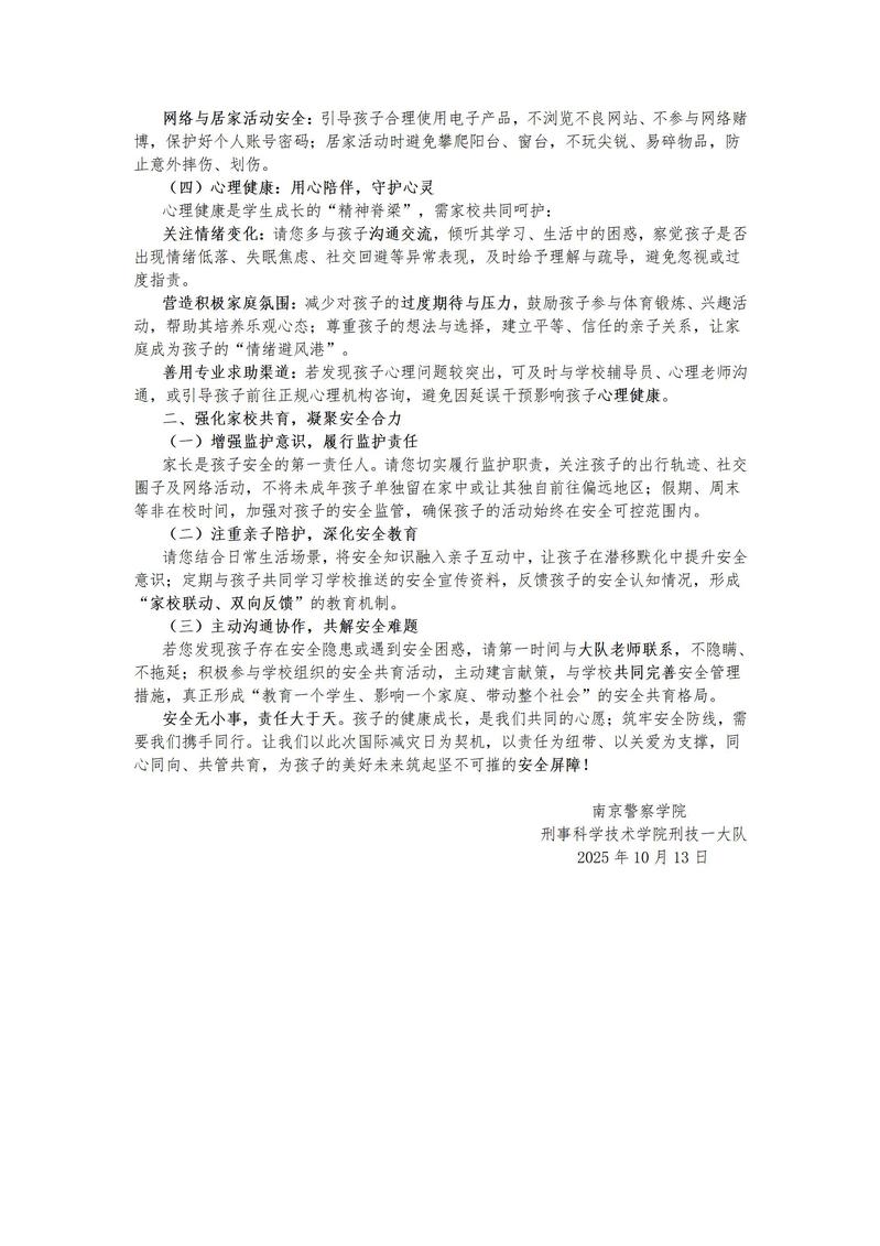 为切实提升同学们的安全防范意识与能力,构筑家校协同的安全防护网,刑技一大队在20251013日于第36个国际减灾日当天组织开展一系列安全宣传教育活动,活动由刑技一大队全体同学参与。