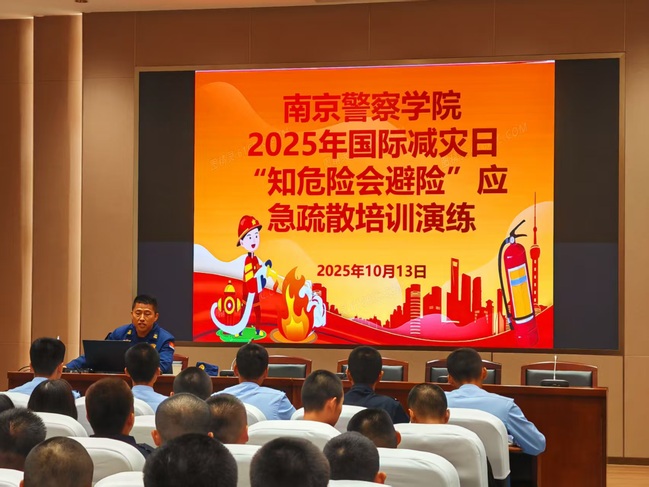 10月13日是第36个国际减灾日,主题是“投资韧性建设,提升防灾减灾能力”。为切实普及防灾减灾知识,进一步提高师生风险防范意识与自救互救能力,13日下午,学院邀请栖霞区消防救援大队教官包富在学院报告厅开展“知危险会避险”专题培训与应急疏散演练。2025级各区队区队长、团支部书记、警体委员和学院消防快速处置队队员、部分教师及保卫处工作人员共计200余人参加培训演练。