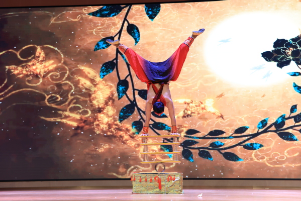 魔术《五彩缤纷》惊艳开场,从飞舞的丝带、腾空的气球中翩然飞出的白鸽,瞬间点燃全场热情,随后的互动环节“消失的水”更让欢声笑语此起彼伏。古彩戏法《罗圈献彩》将观众带入中华传统艺术的精妙世界,六环相扣、彩物频现,不仅展现了技艺之精,更传递着美好寓意。杂技《问酒当歌》则以顶碗绝技生动诠释了“台上十分钟、台下十年功”的真谛,演员在方寸之间展现的极致平衡,令人叹服。